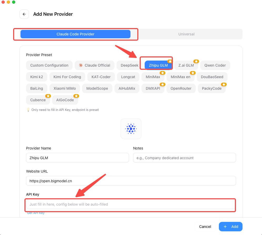 Select Claude and Add an API Key
