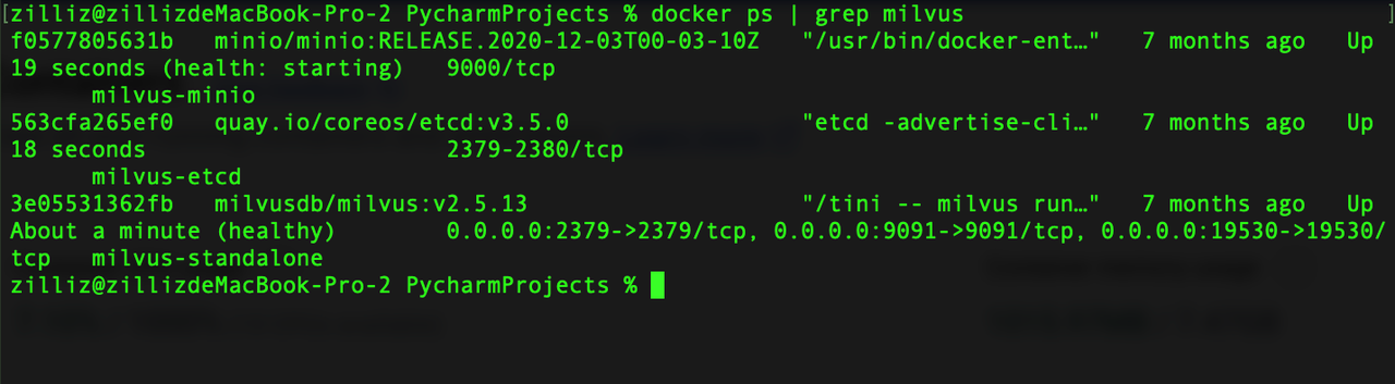 # You should see three containers: milvus-standalone, milvus-etcd, milvus-minio