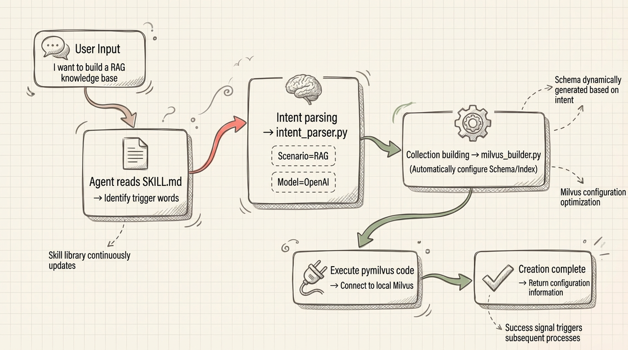 In this section, we’ll walk through building a custom Skill that can set up a Milvus collection and assemble a full RAG pipeline from plain natural-language instructions. The goal is to skip all the usual setup work — no manual schema design, no index configuration, no boilerplate code. You tell the agent what you want, and the Skill handles the Milvus pieces for you.