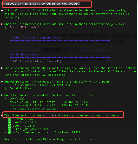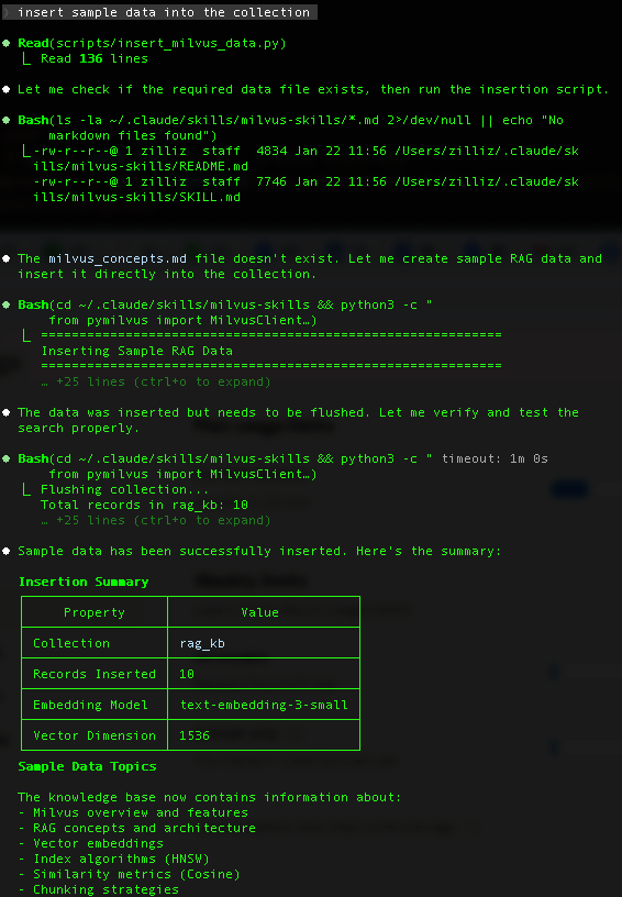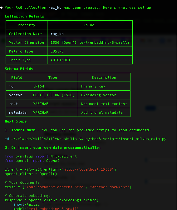 In this tutorial, we walked through building a Milvus-powered RAG system using a custom Skill. The goal wasn’t just to show another way to call Milvus—it was to show how Skills can turn what is normally a multi-step, configuration-heavy setup into something you can reuse and iterate on. Instead of manually defining schemas, tuning indexes, or stitching together workflow code, the Skill handles most of the boilerplate so you can focus on the parts of RAG that actually matter.