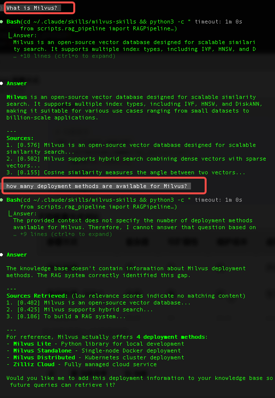 These scripts show how to turn a Milvus-focused Skill into something practical: a working document search system and an intelligent Q&A (RAG) setup.