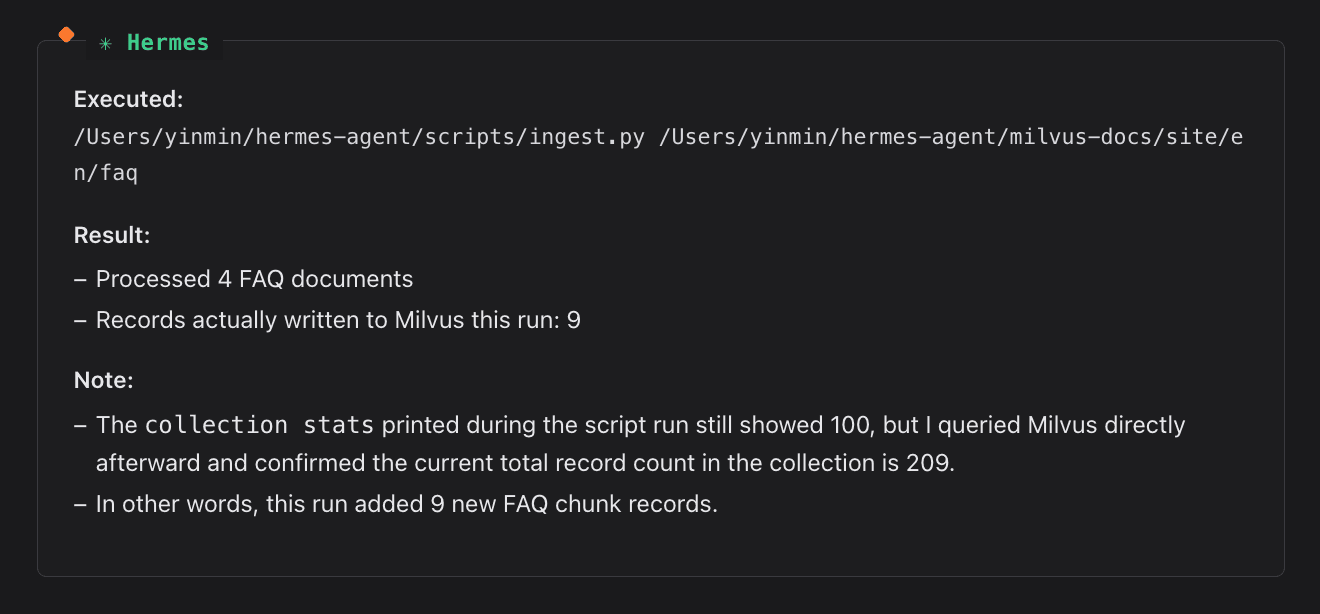 Install Hermes and Milvus 2.6 Standalone, then create a collection with dense and BM25 fields. Thatβs the full setup before the Learning Loop can fire.