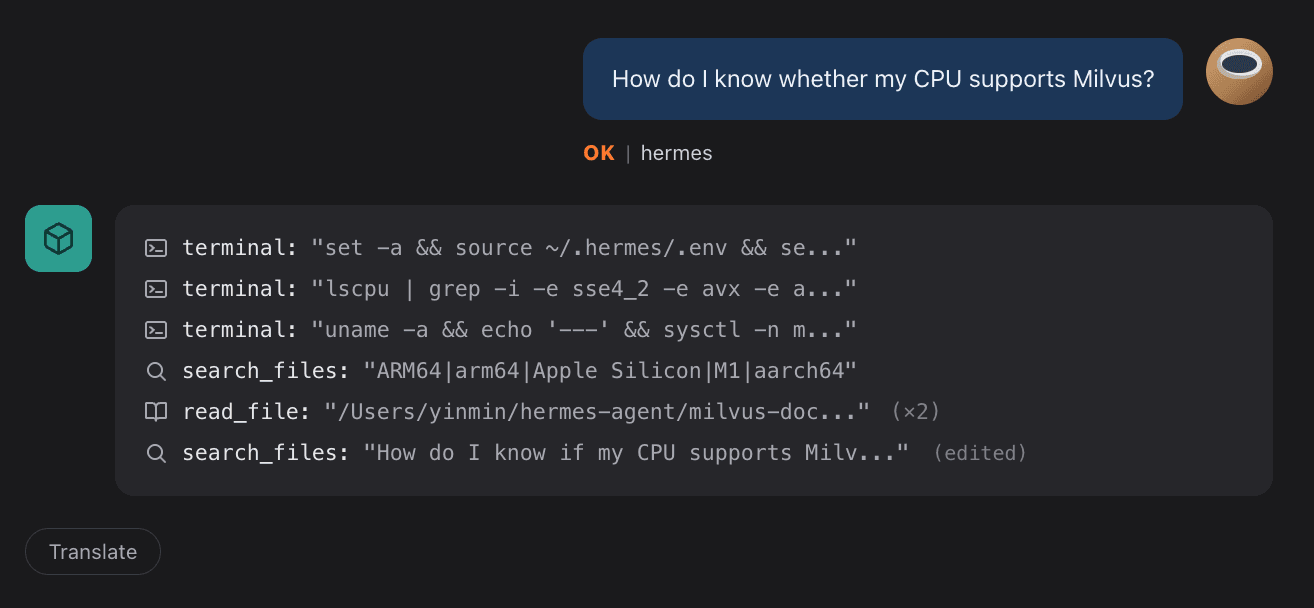 The fix is Milvus 2.6. Its hybrid search covers both meaning and exact keywords in a single query, so the loop can finally connect rephrased information across sessions. Itβs light enough to fit on a small cloud server (a $5/month VPS runs it). Swapping it in doesnβt require changing Hermes β Milvus slots behind the retrieval layer, so the Learning Loop stays intact. Hermes still picks which Skill to run, and Milvus handles what to retrieve.