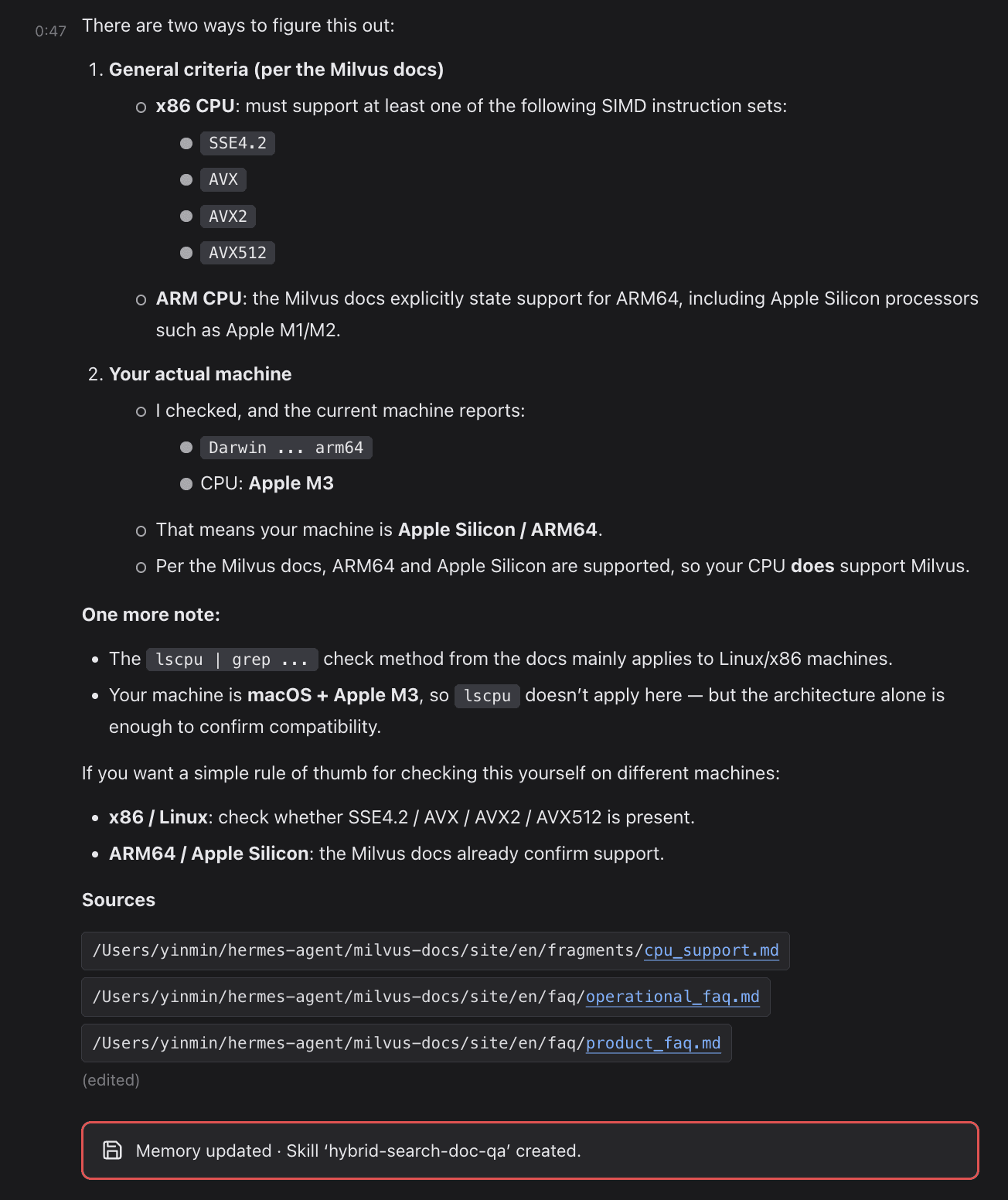 Most RAG (retrieval-augmented generation) systems solve the storing-and-fetching problem, but the fetch logic itself is hard-coded in application code. Ask in a different way or in a new scenario, and retrieval breaks. Hermes stores the fetch strategy as a Skill, which means the fetch path becomes a document you can read, edit, and version. The line πΎ Memory updated Β· Skill 'hybrid-search-doc-qa' created isnβt a setup-complete marker. Itβs the Agent committing a behavior pattern to long-term memory.