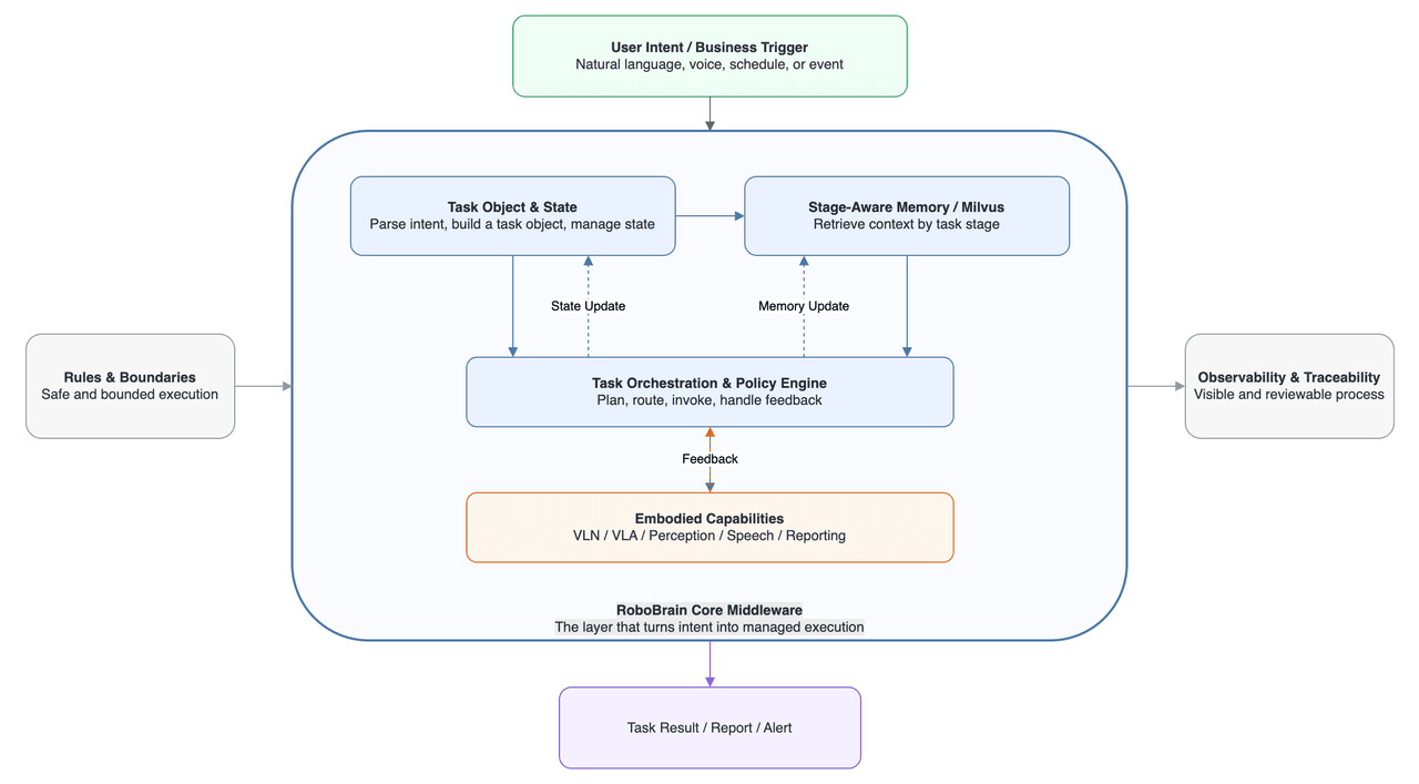 RoboBrain core middleware architecture showing how user intent flows through task objects, stage-aware memory powered by Milvus, and a policy engine before reaching embodied capabilities
