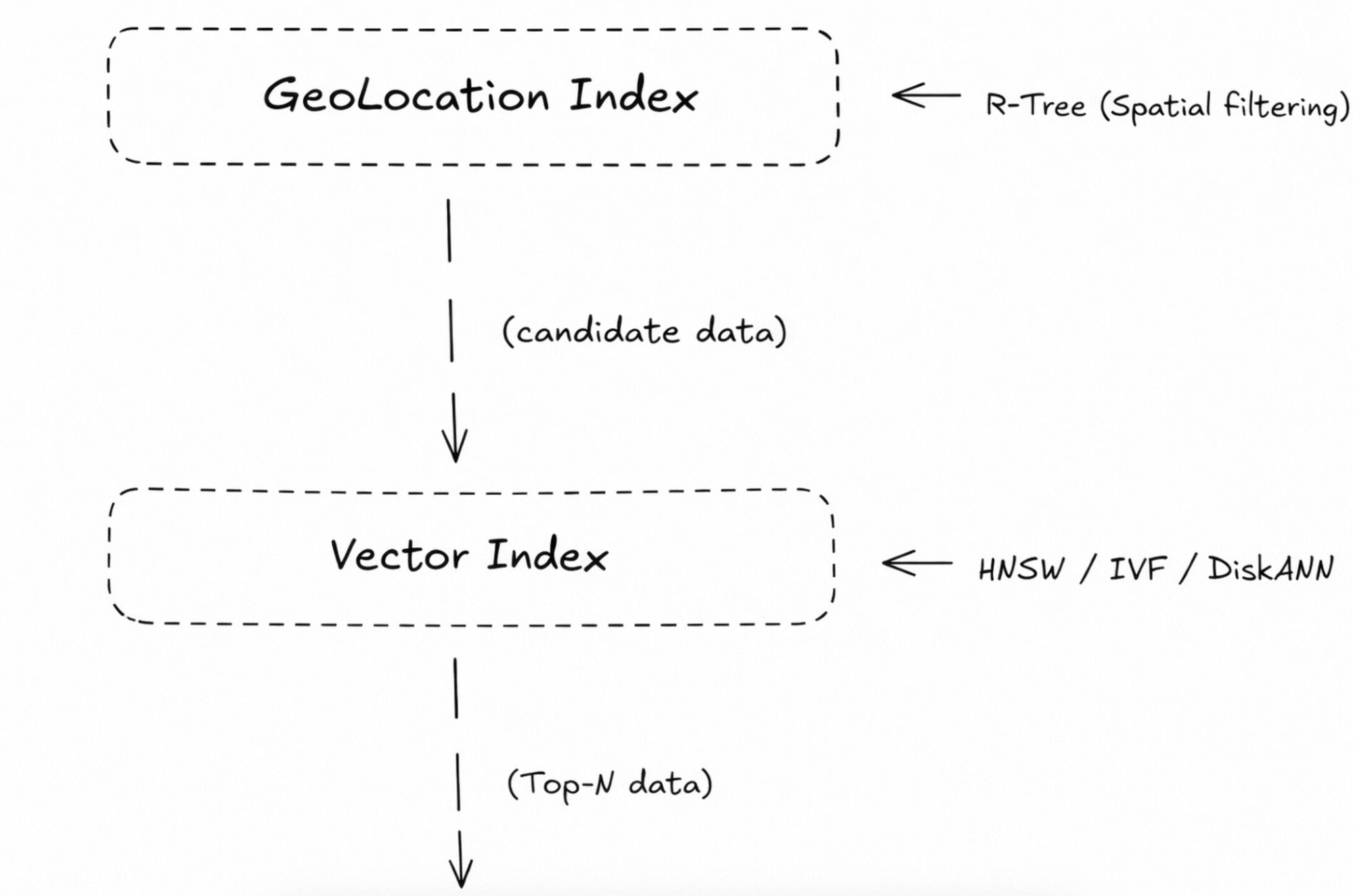 - Inefficient filtering. If the system ran vector search first, it often returned many results that were far from the user and had to be discarded later. If it applied location filtering first, the remaining set was still large, so the vector search step was still expensive.