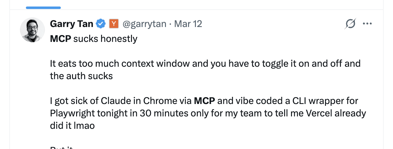 When Perplexity’s CTO Denis Yarats said at ASK 2026 that the company was deprioritizing MCP internally, it set off the usual cycle. YC CEO Garry Tan piled on — MCP eats too much context window, auth is broken, he built a CLI replacement in 30 minutes. Hacker News ran strongly anti-MCP.