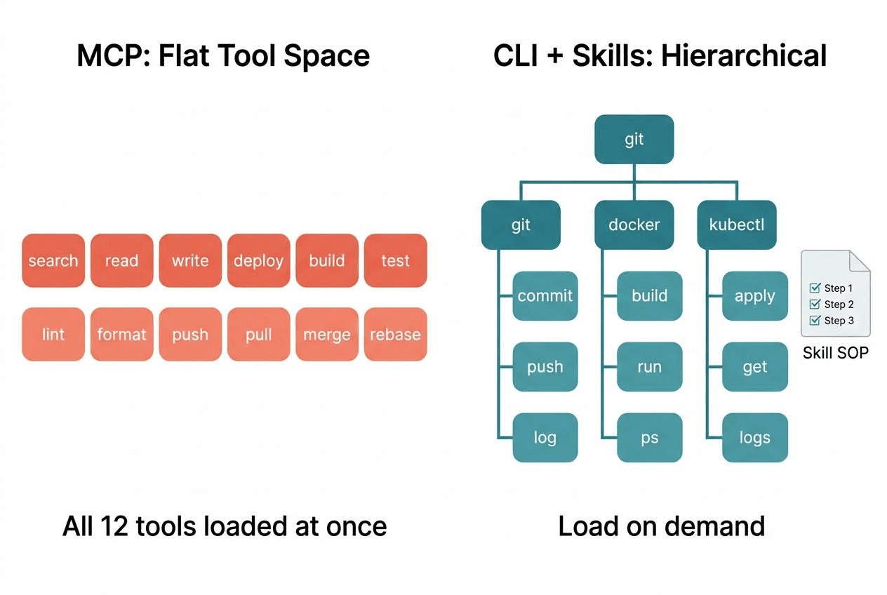 CLI tools offer a similar advantage. An agent runs git --help or docker --help to discover capabilities on demand, without preloading every parameter definition. Context cost is pay-as-you-go, not upfront.