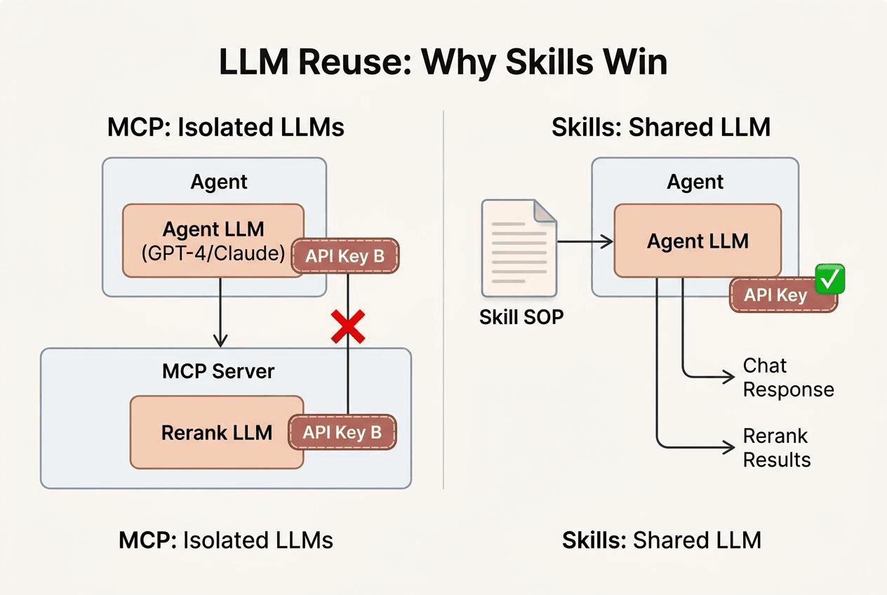 MCP is a tool-calling protocol that defines how an agent discovers and invokes external tools. An Agent Skill is a Markdown file containing a full standard operating procedure — triggers, step-by-step instructions, error handling, and escalation rules. The key architectural difference: Skills run inside the agent’s process, so they can leverage the agent’s own LLM for judgment calls like relevance filtering or result reranking. MCP tools run in a separate process and can’t access the agent’s intelligence. Skills also use progressive disclosure — only lightweight metadata loads at startup, with full content loading on demand — keeping context window usage minimal compared to MCP’s upfront schema loading.