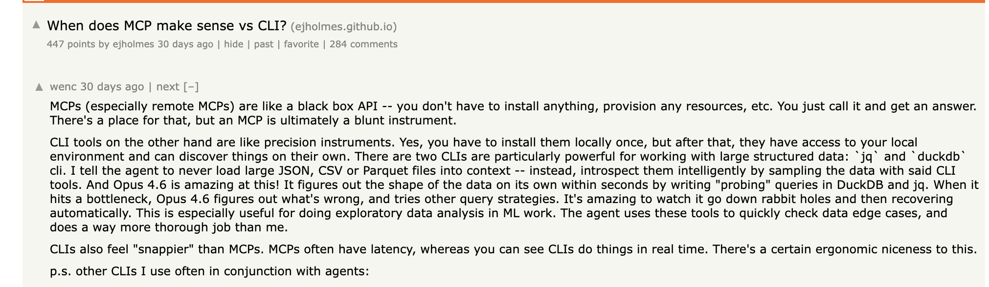 A Hacker News thread — “When does MCP make sense vs CLI?” — drew responses that mostly favored CLI: “CLI tools are like precision instruments,” “CLIs also feel snappier than MCPs.” Some developers hold a more balanced view: Skills are a detailed recipe that helps you solve a problem better; MCP is the tool that helps you solve the problem. Both have their place.