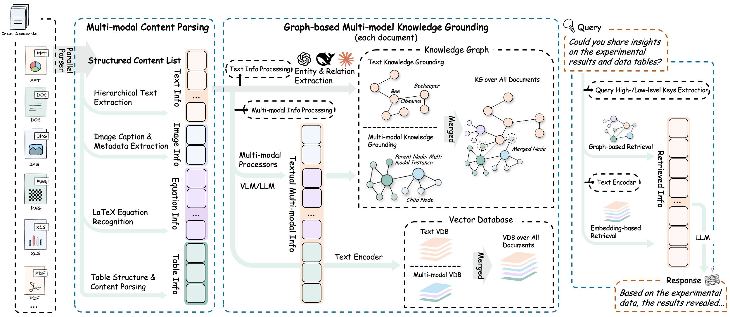 The framework supports documents containing text, diagrams, tables, and mathematical expressions, enabling users to query across all modalities through a single cohesive interface. This makes it particularly useful in fields such as academic research, financial reporting, and enterprise knowledge management, where multimodal materials are common.