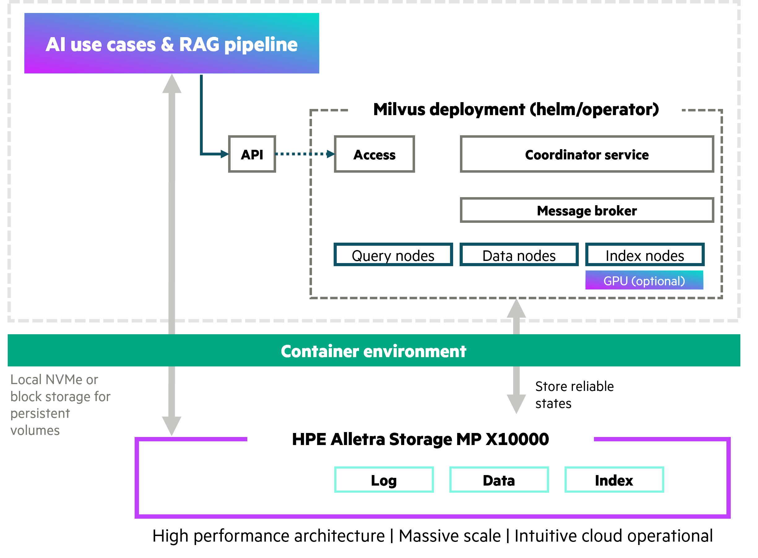 HPE Alletra Storage MP X10000 and Milvus complement each other to deliver RAG that is fast, predictable, and easy to scale. Figure 1 illustrates the architecture of scalable AI use cases and RAG pipelines, showing how Milvus components deployed in a containerized environment interact with high performance object storage from HPE Alletra Storage MP X10000.