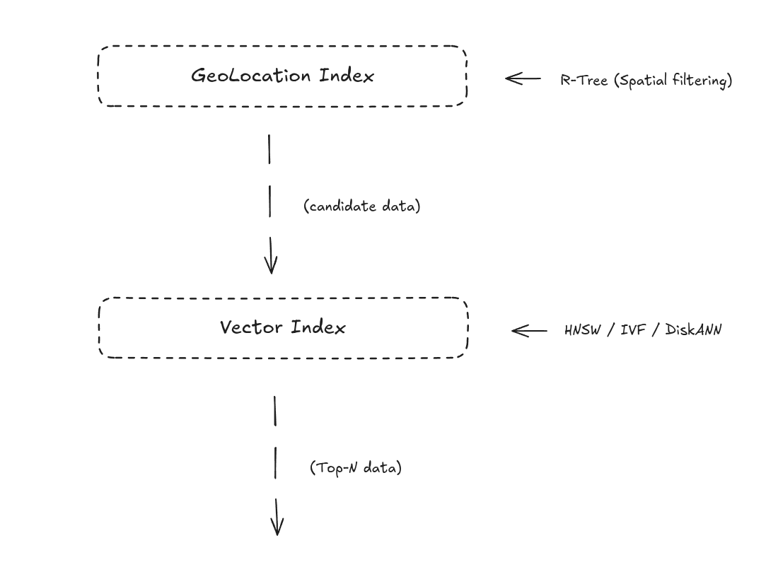 Joint retrieval â First apply a spatial filter (e.g., restaurants within 3 km), then use vector search to rank by similarity, taste preference, or quality.
