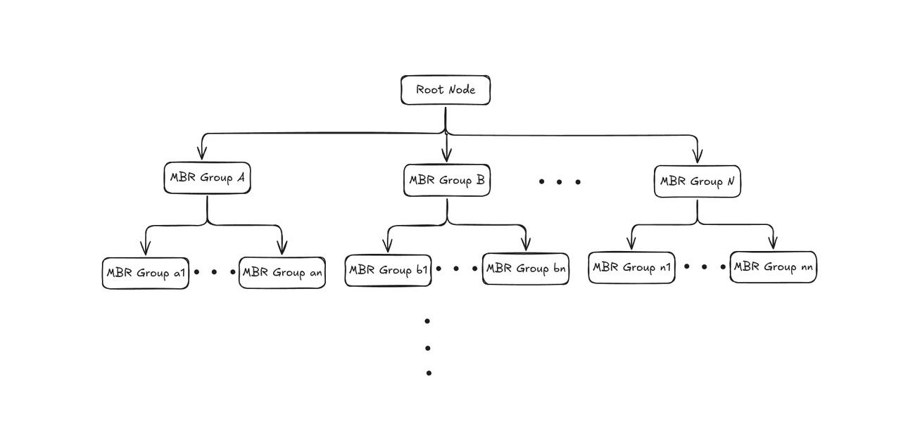 3. Add the root node: Create a root node whose MBR covers all internal groups, forming a height-balanced tree structure.